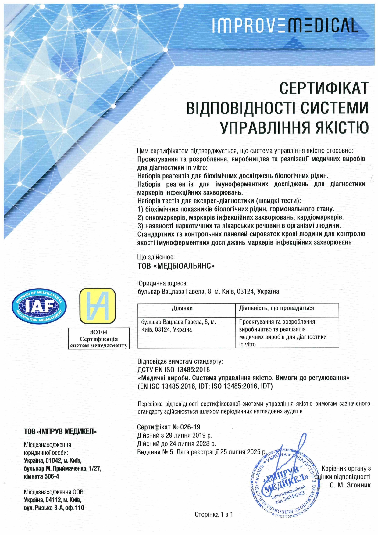 **На предприятии внедрена и поддерживается система управления качеством согласно ДСТУ EN ISO 13485:2018.